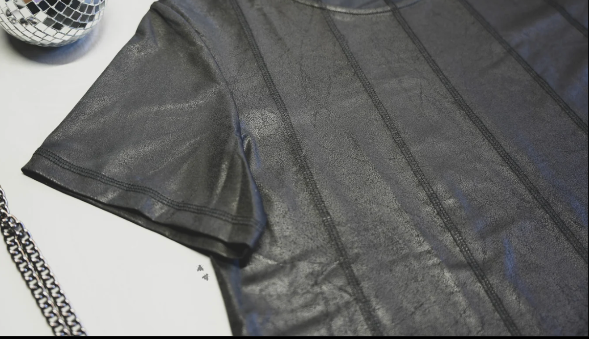 OUR FAVORITE MATERIAL "leather lux" in a NEW CUT - flowy and goes AWAY from the body - it's a winner for sure.